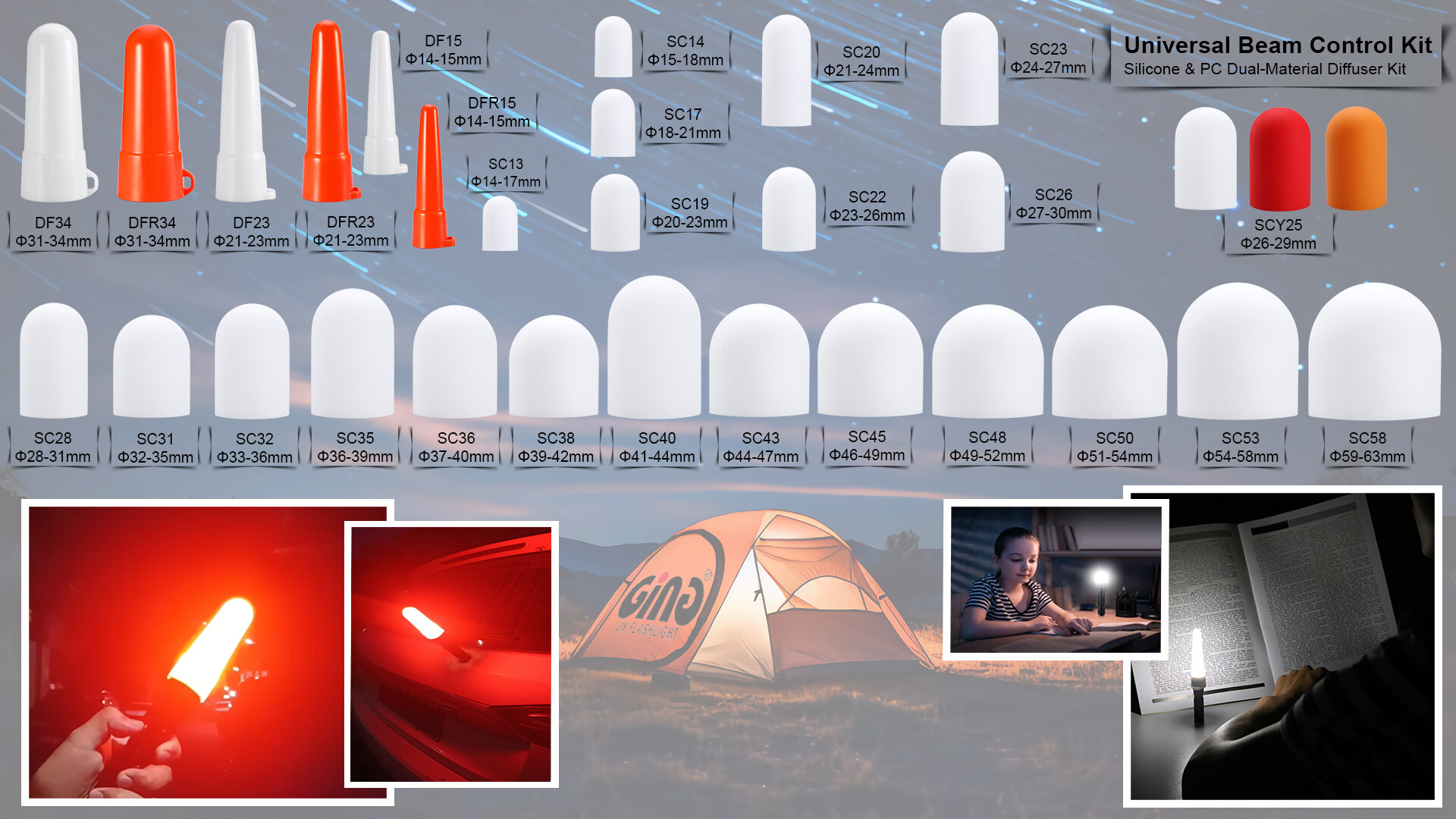 Universal Silicone Light Diffuser Cap – Compatible with flashlight heads 20-38mm. Soft, durable silicone cover transforms harsh beam into evenly diffused glow. Ideal for outdoor camping, reading, tent lighting, or emergency lighting.